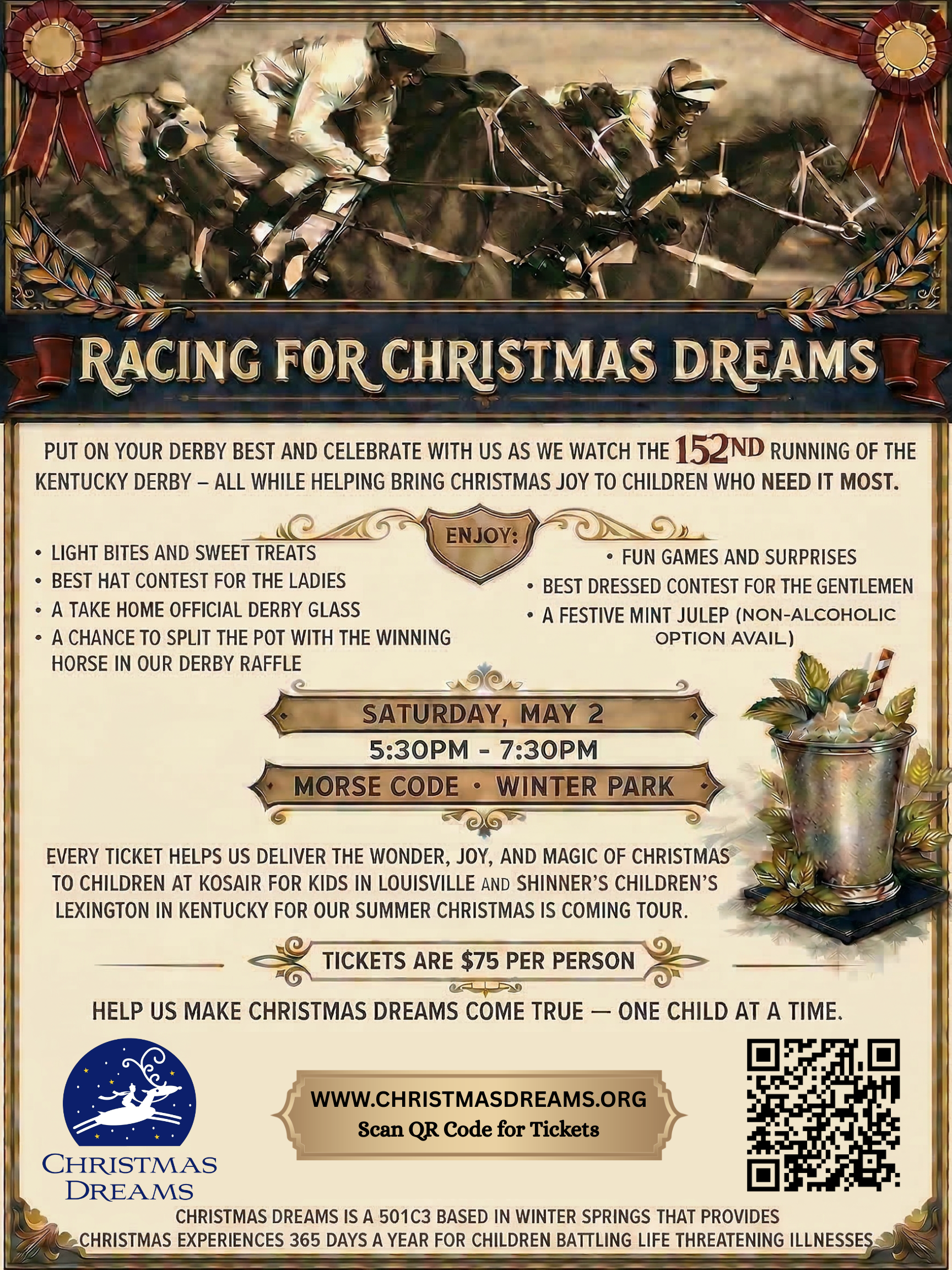 Join us on Saturday, May 2 in Winter Park for an unforgettable evening at Racing for Christmas Dreams, a Kentucky Derby–inspired celebration supporting Christmas Dreams, an organization dedicated to bringing joy to children with life-threatening illnesses. Dress in your Derby best and enjoy light bites, festive drinks, games, and lively contests, all while watching the excitement of the race. Each ticket helps deliver magical Christmas experiences to children in need, making this a night of fun, community, and meaningful impact.
